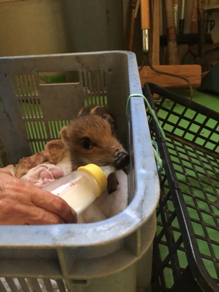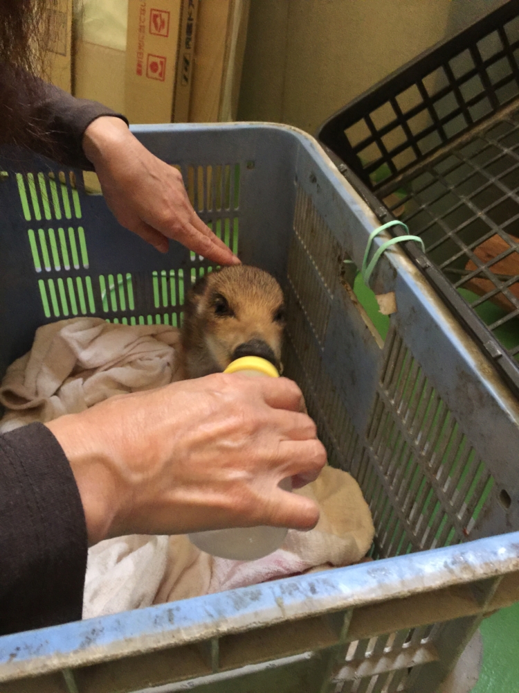 ウチの会長が下山の方のお客様(山奥)へ行く途中に見つけたらしい(よう捕まえたんですけど、、、)そのまま事務所へ、、、うりぼうでも突進がすごくカゴが揺れるほどです。